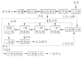 屠宰廢水常采用以水解酸化/三級生物接觸氧化為主的處理工藝,如下圖: